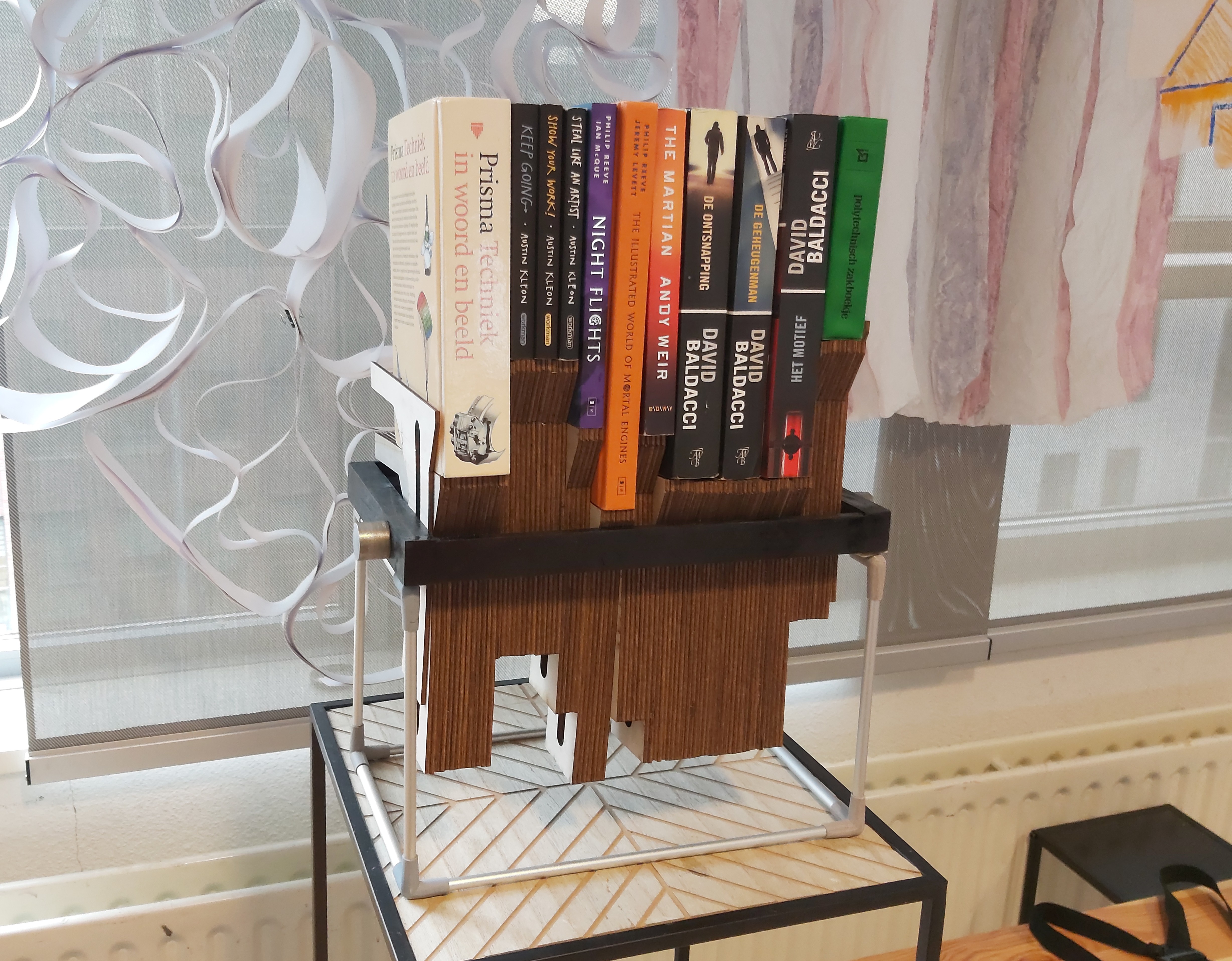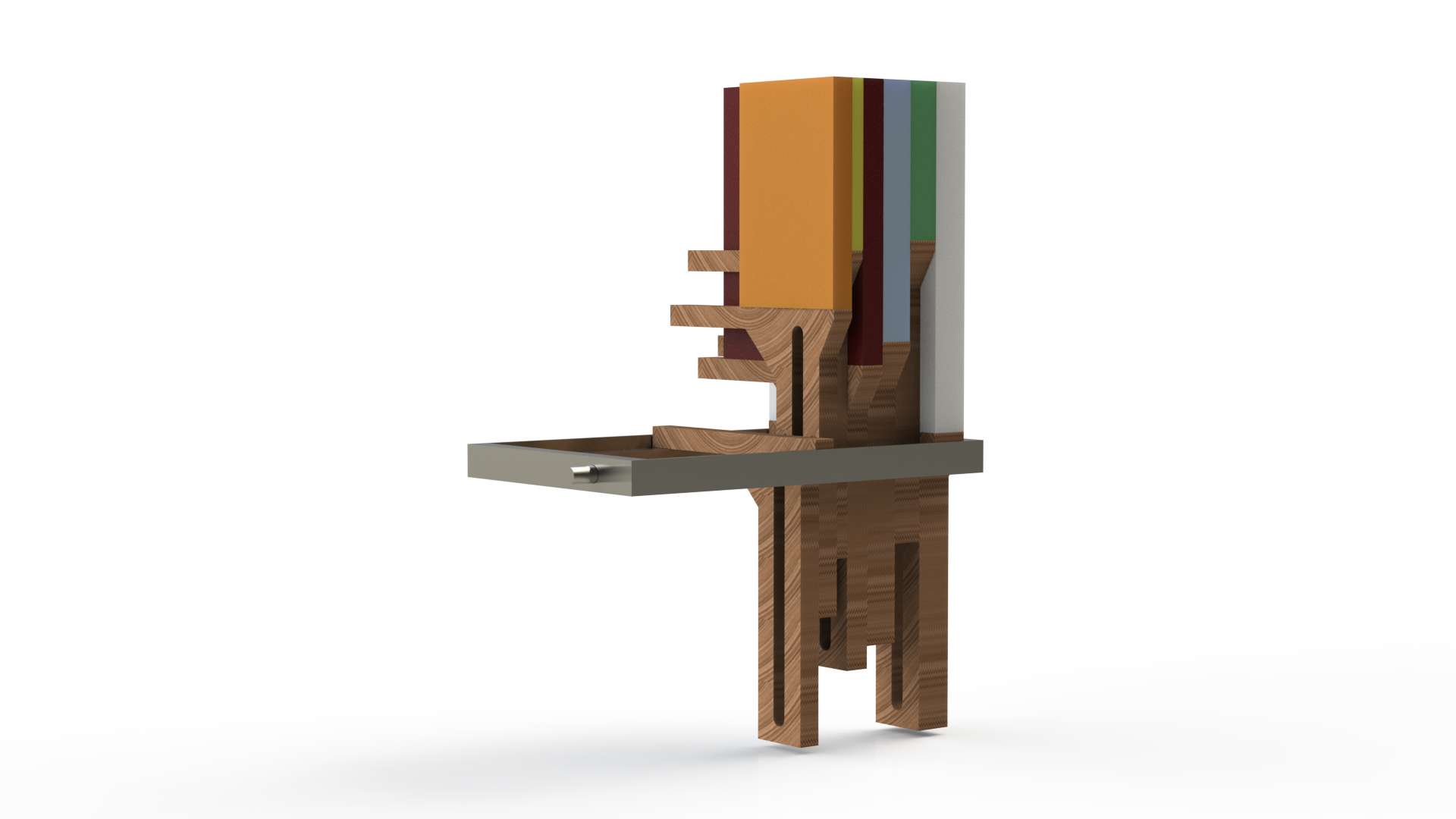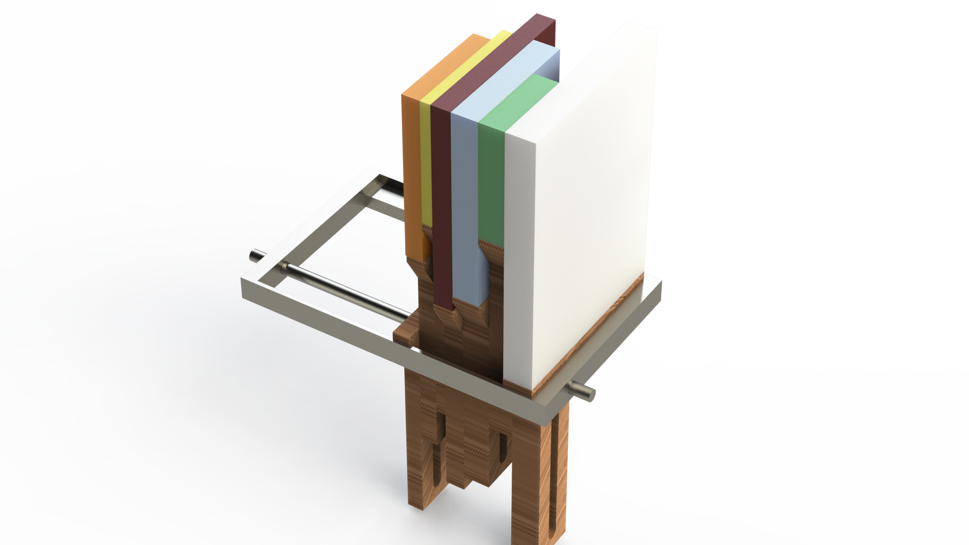 I took inspiration from a contour gauge to have an array of thin laser cut panels that allow you to add up to the thickness of each book over 3mm. The length of the panel was chosen to accomodate my smallest and largest books. The panels are loose in a frame and have a threaded axle going through. When you tighten the ends of the axle the panels are clamped together by friction and thus can be adjusted and held at any height.