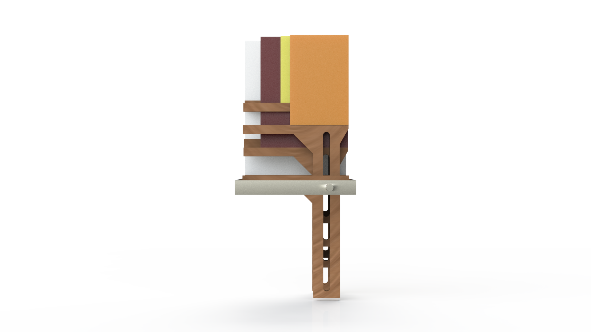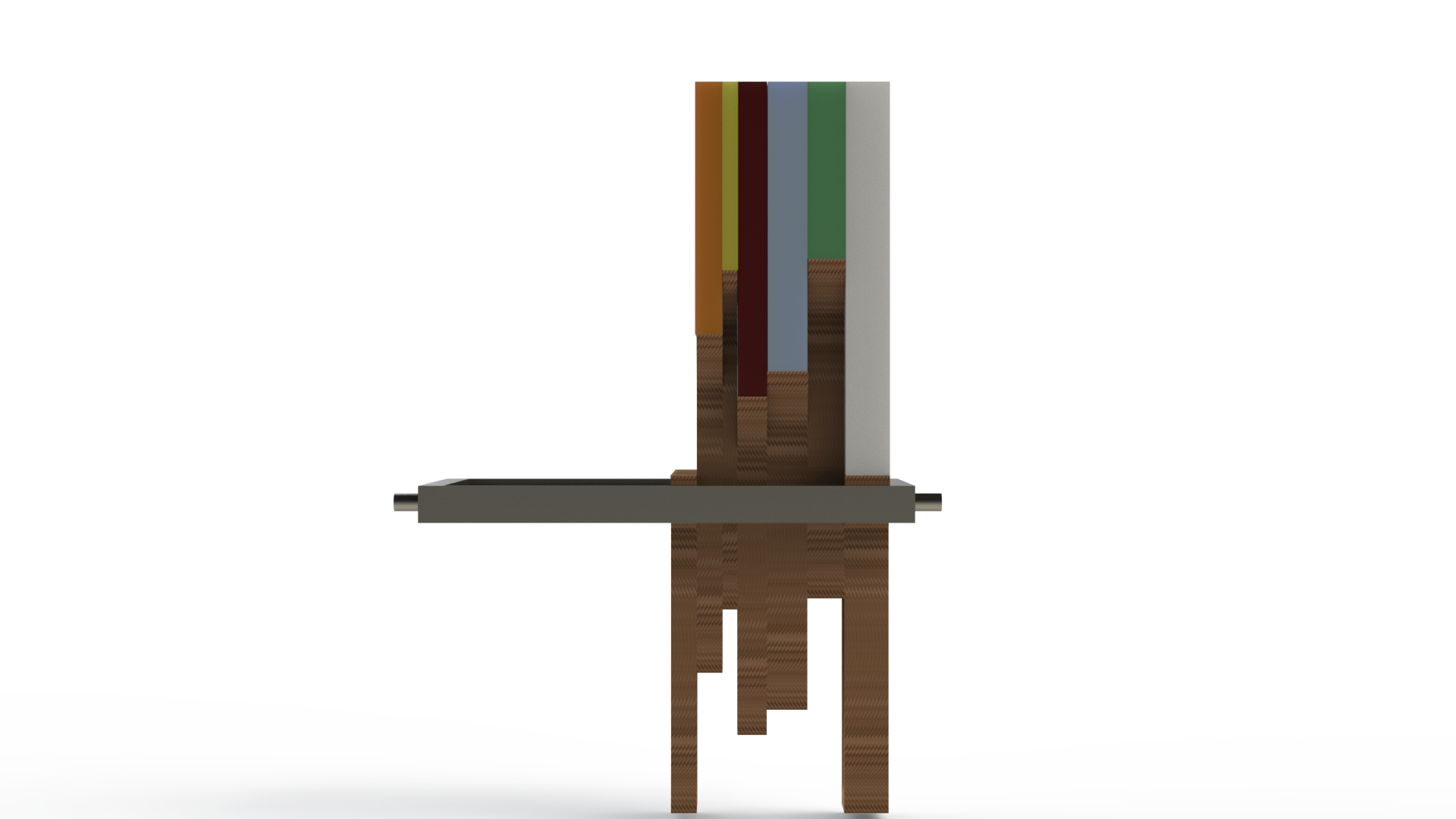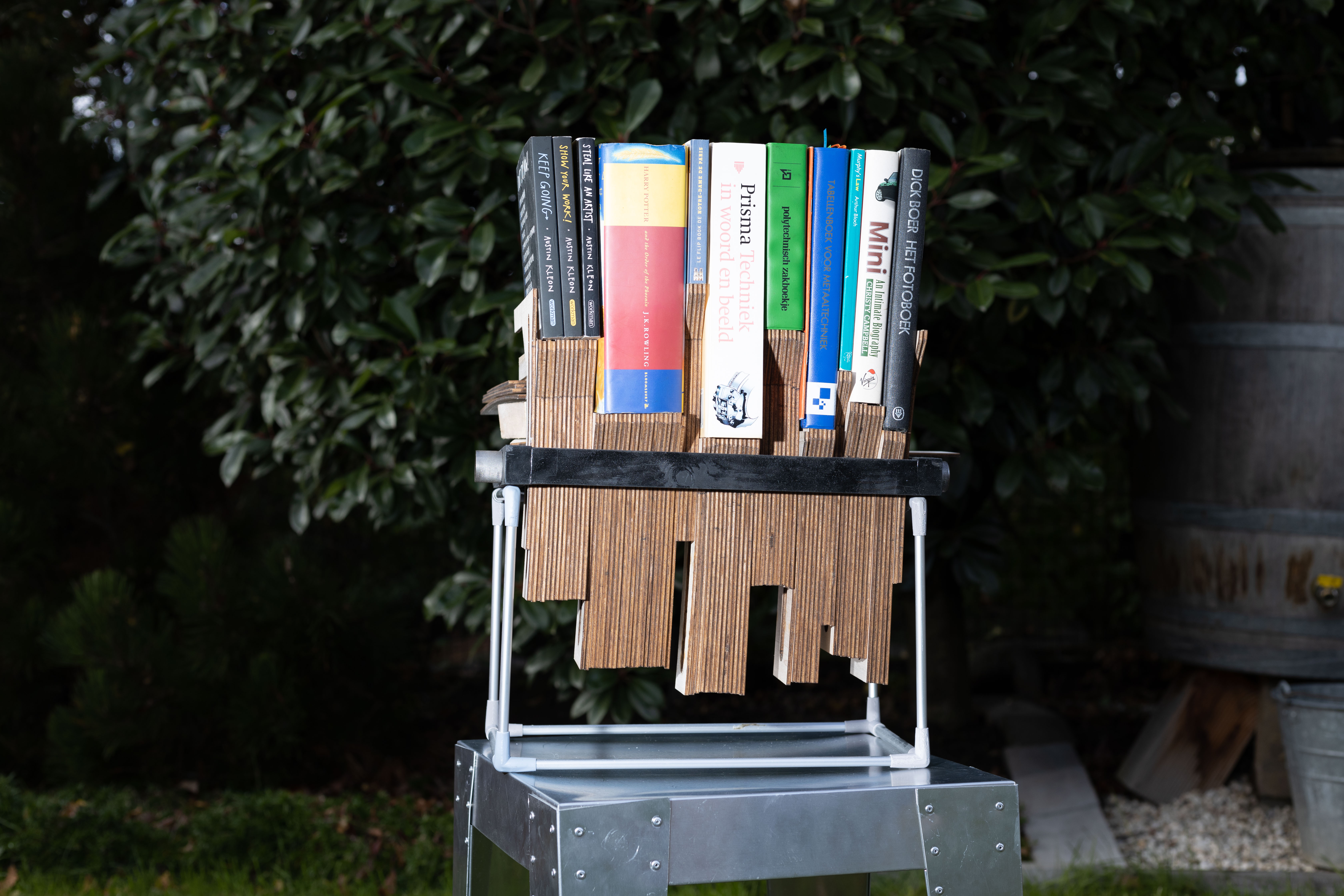 I took inspiration from a contour gauge to have an array of thin laser cut panels that allow you to add up to the thickness of each book over 3mm. The length of the panel was chosen to accomodate my smallest and largest books. The panels are loose in a frame and have a threaded axle going through. When you tighten the ends of the axle the panels are clamped together by friction and thus can be adjusted and held at any height.