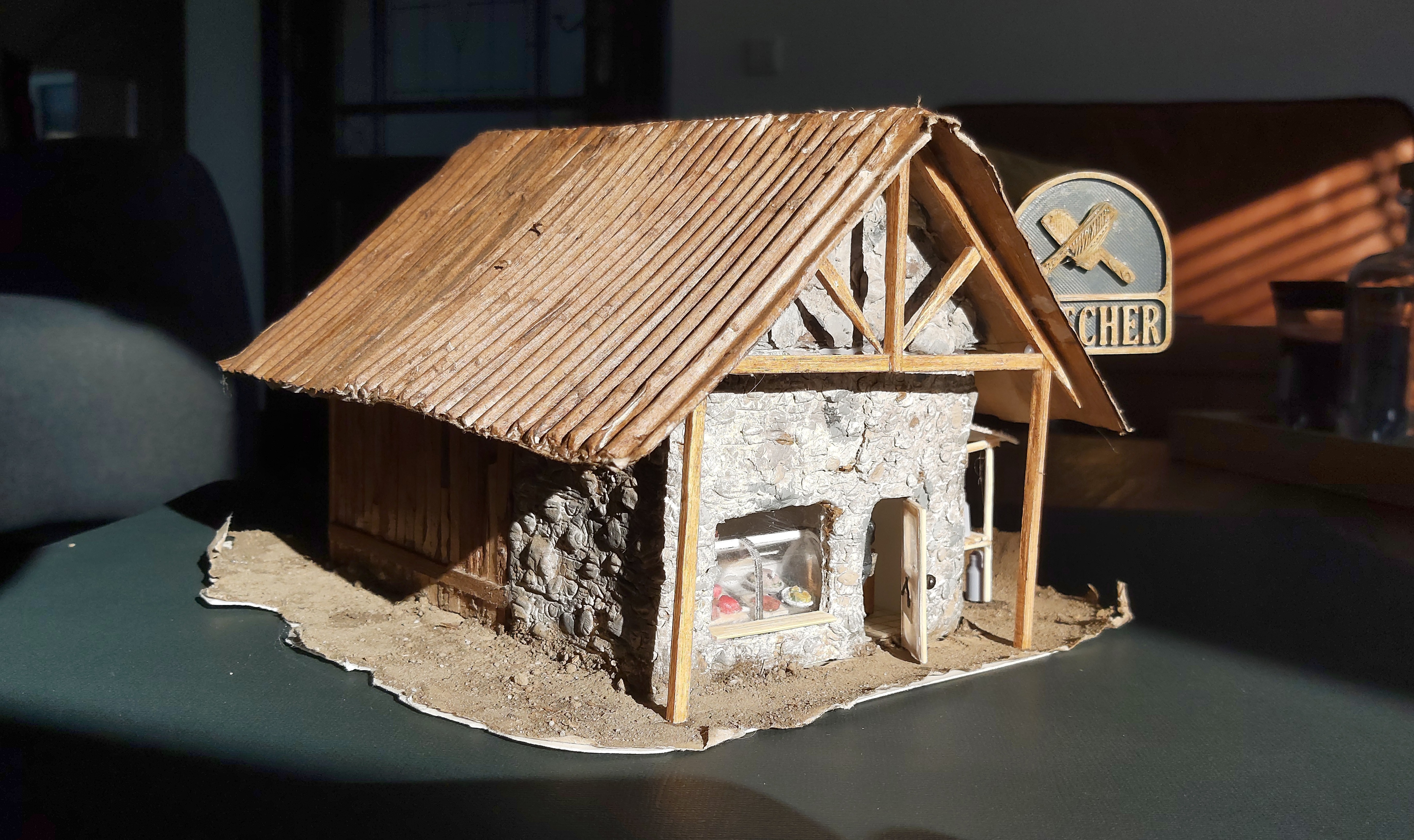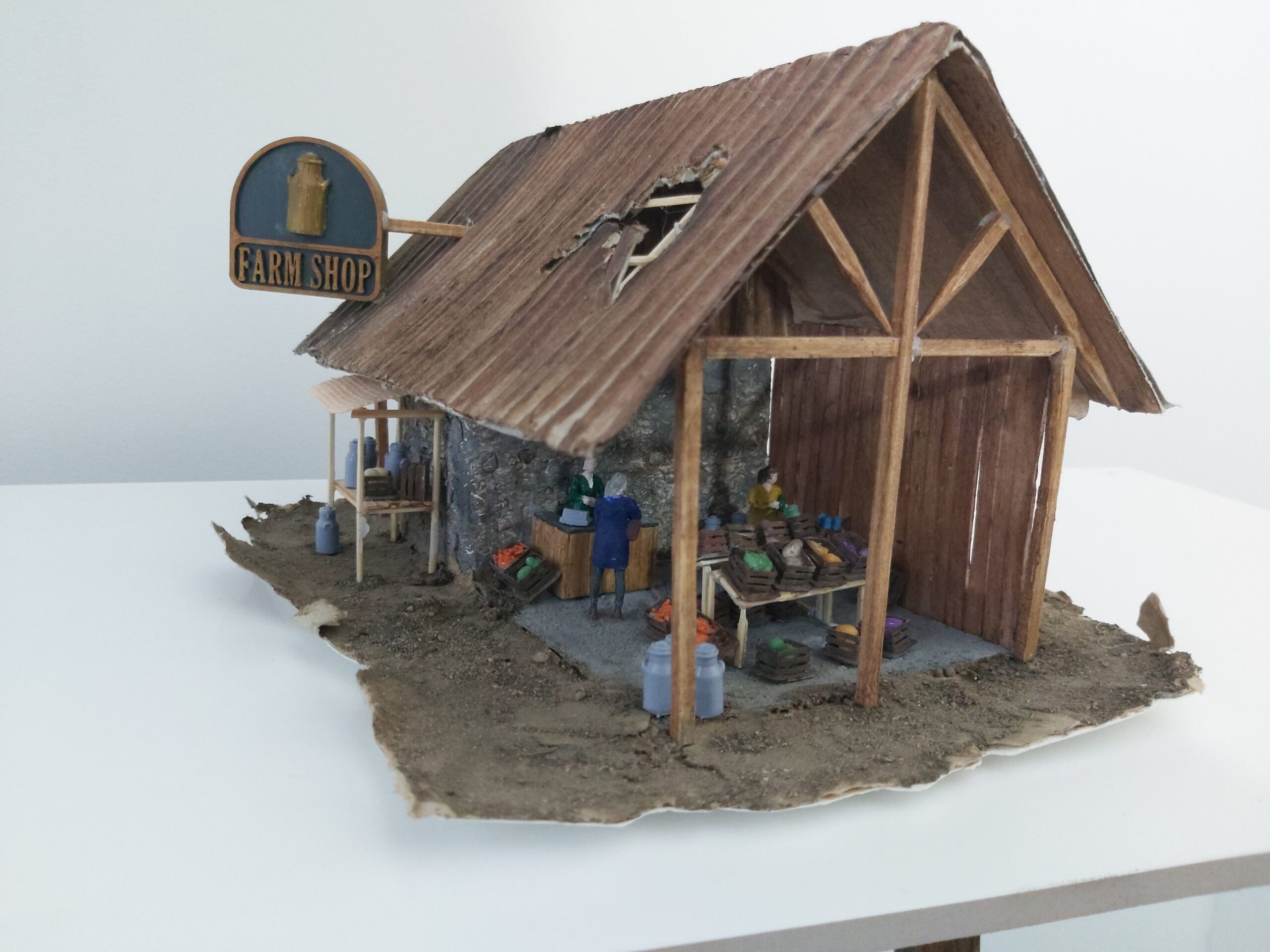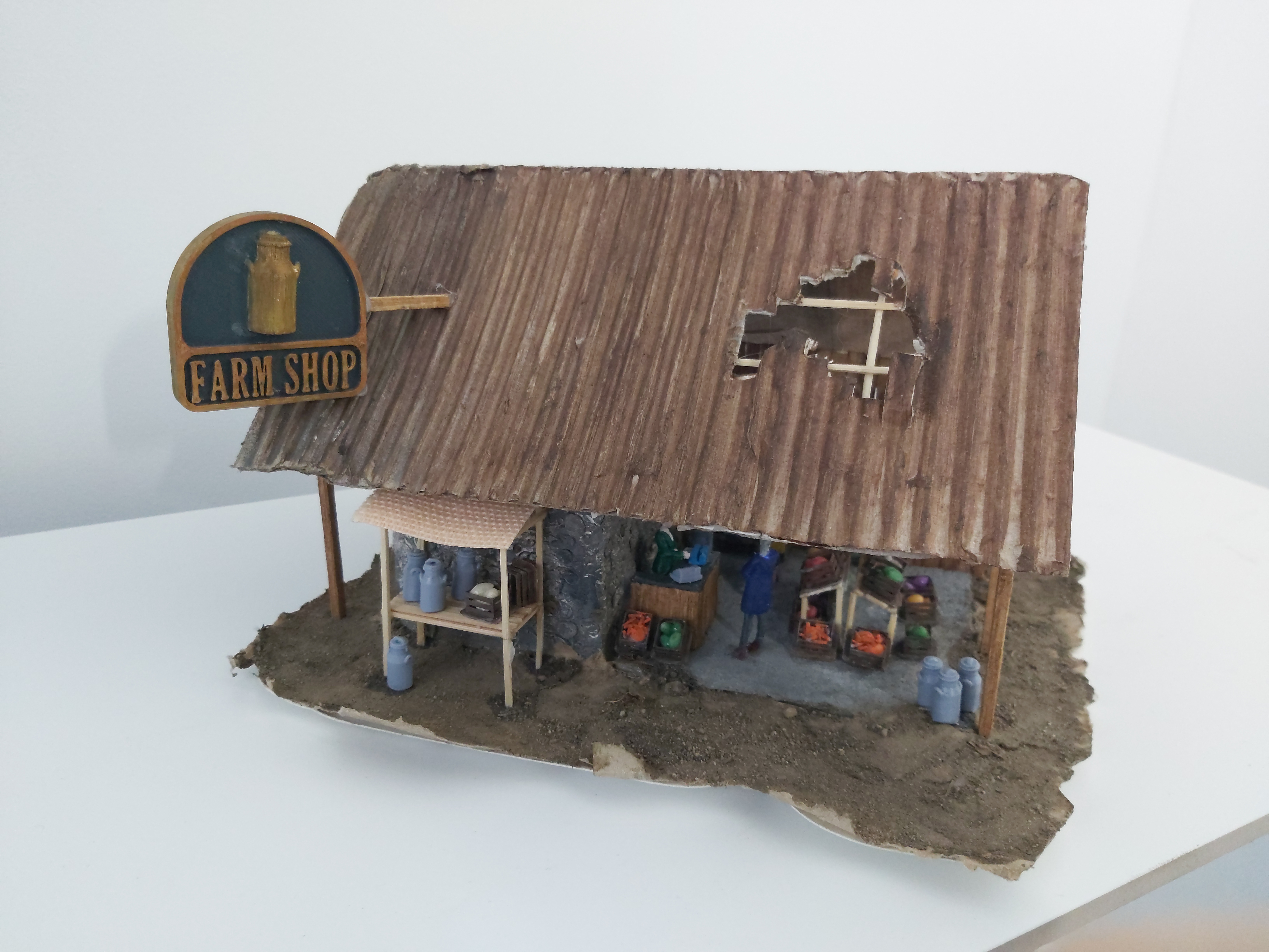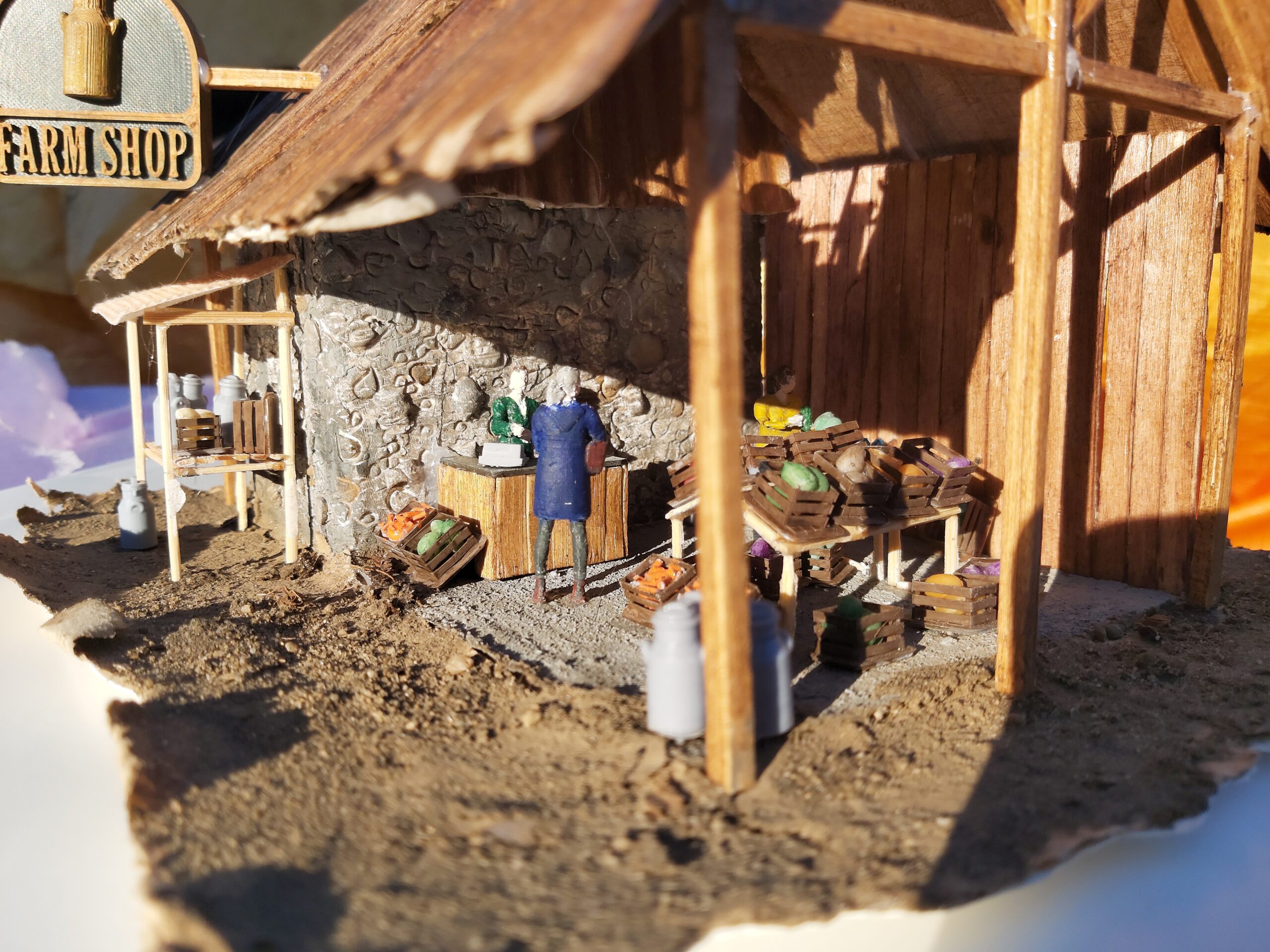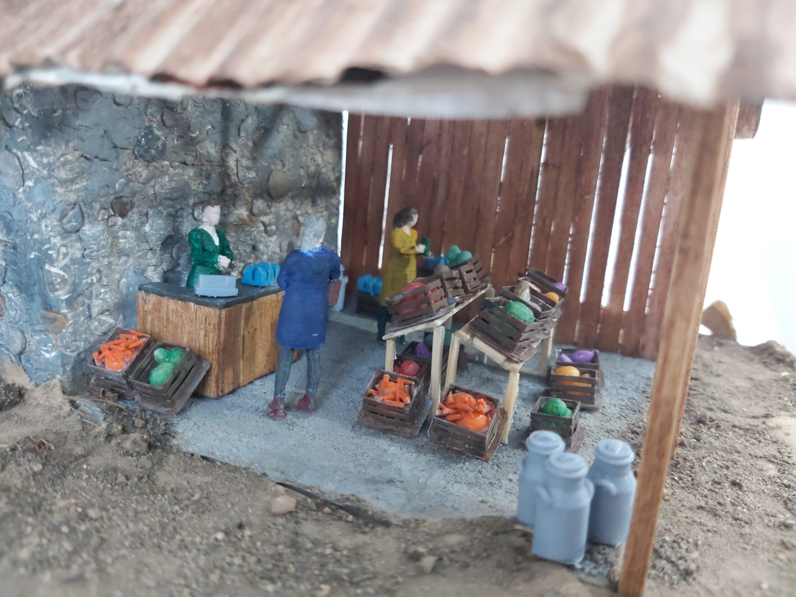 The building itself is mostly made out of cardboard, skewers balsa wood and a bit of clay. The smaller details are mostly 3D printed parts like the people, the wooden crates and the milk cans, just so I could have them correctly scaled and detailed. Some other details are random things I found painted to look like something else.