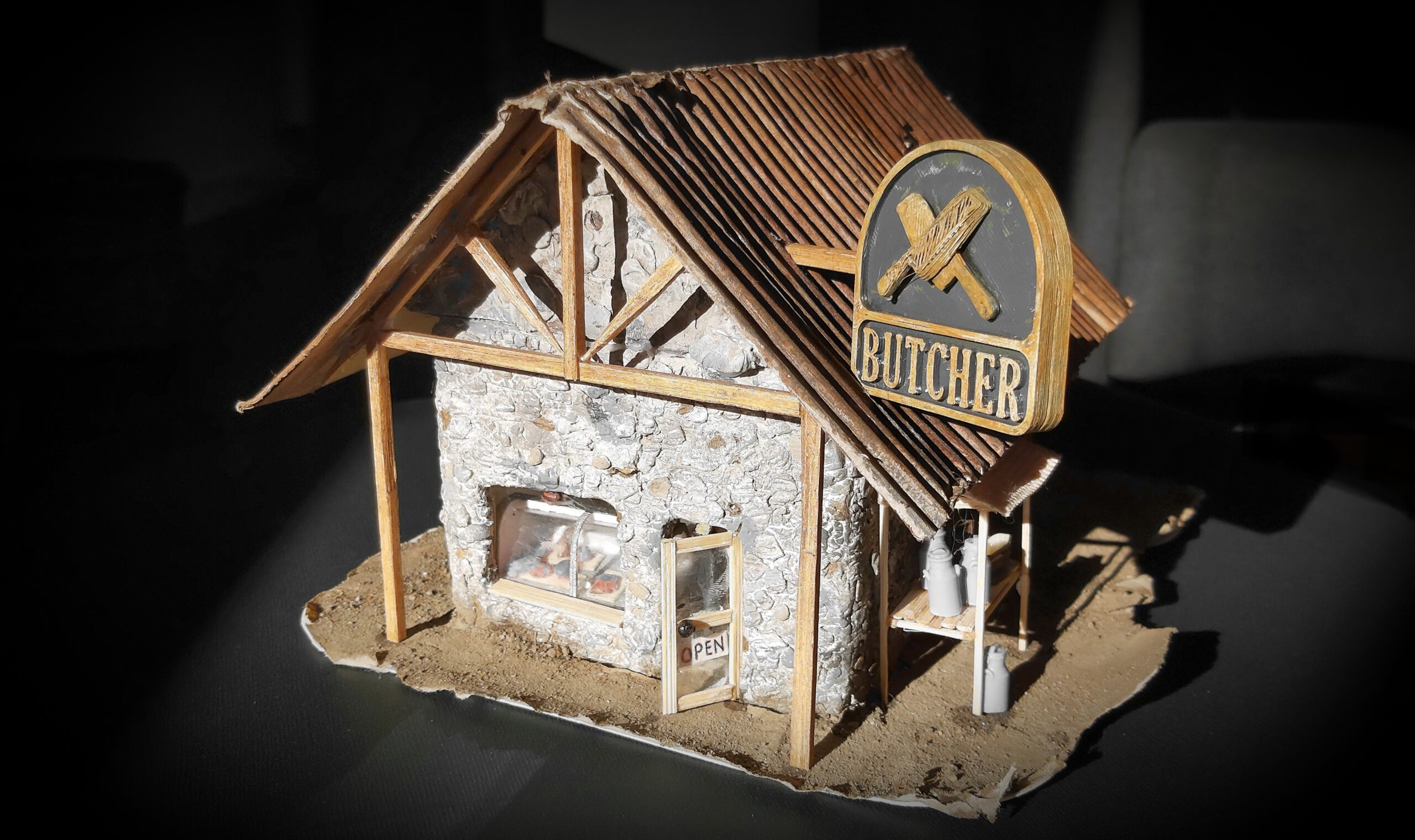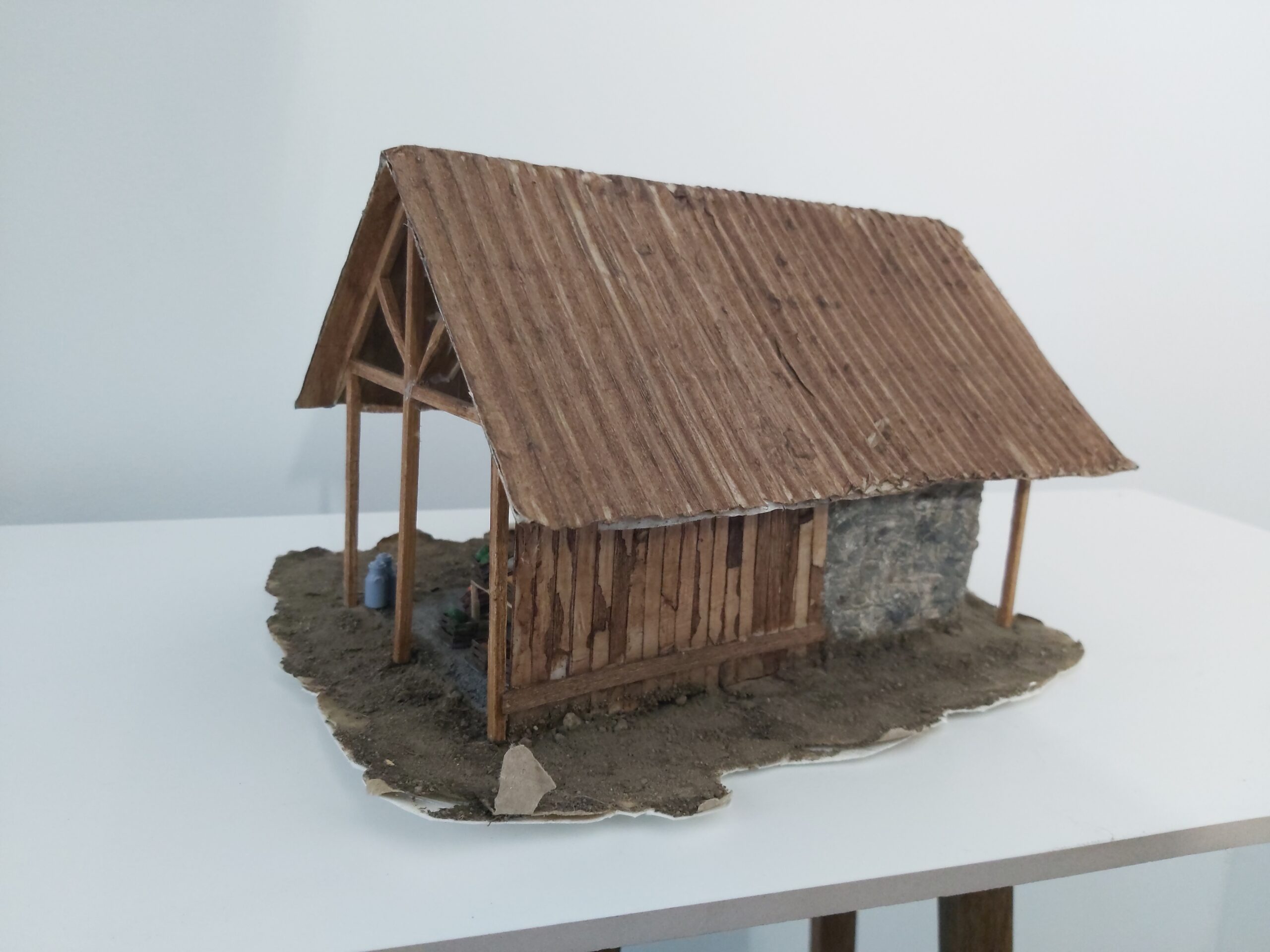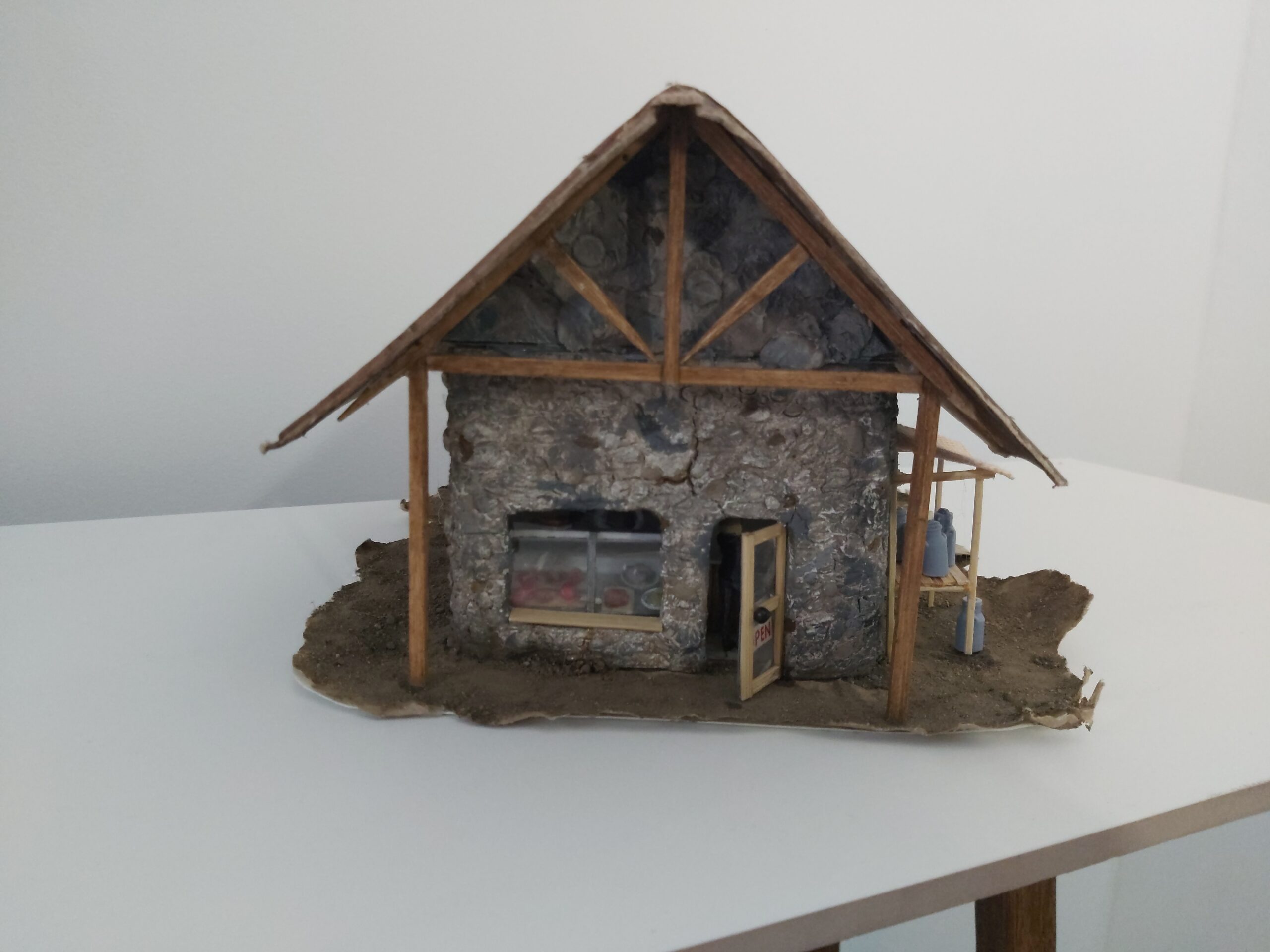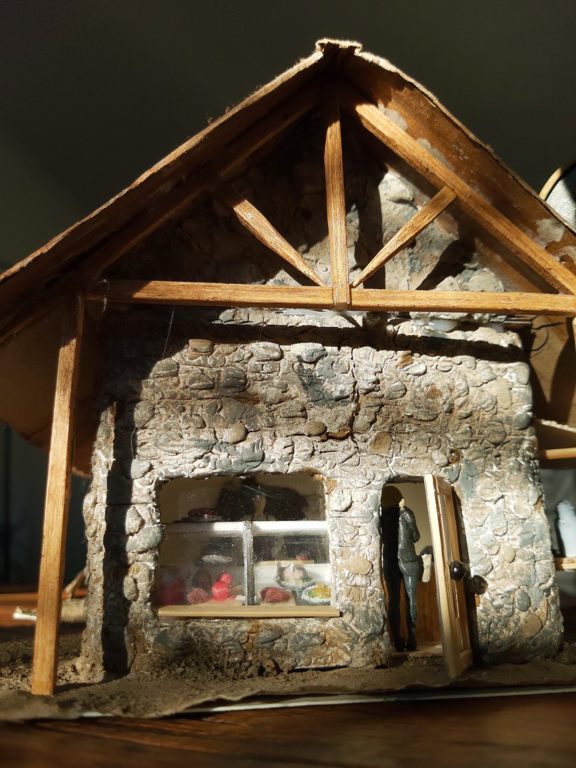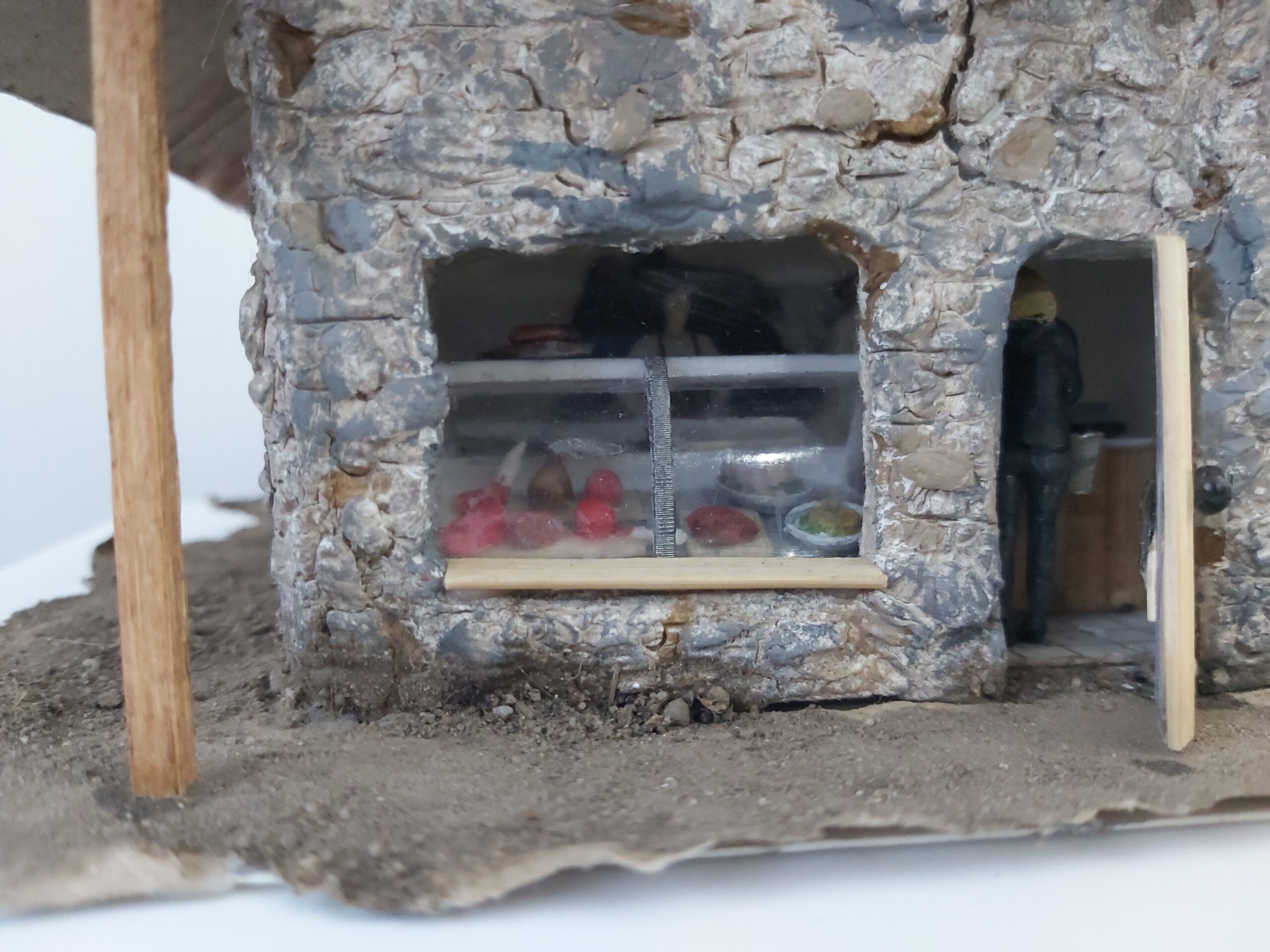 The building itself is mostly made out of cardboard, skewers balsa wood and a bit of clay. The smaller details are mostly 3D printed parts like the people, the wooden crates and the milk cans, just so I could have them correctly scaled and detailed. Some other details are random things I found painted to look like something else.