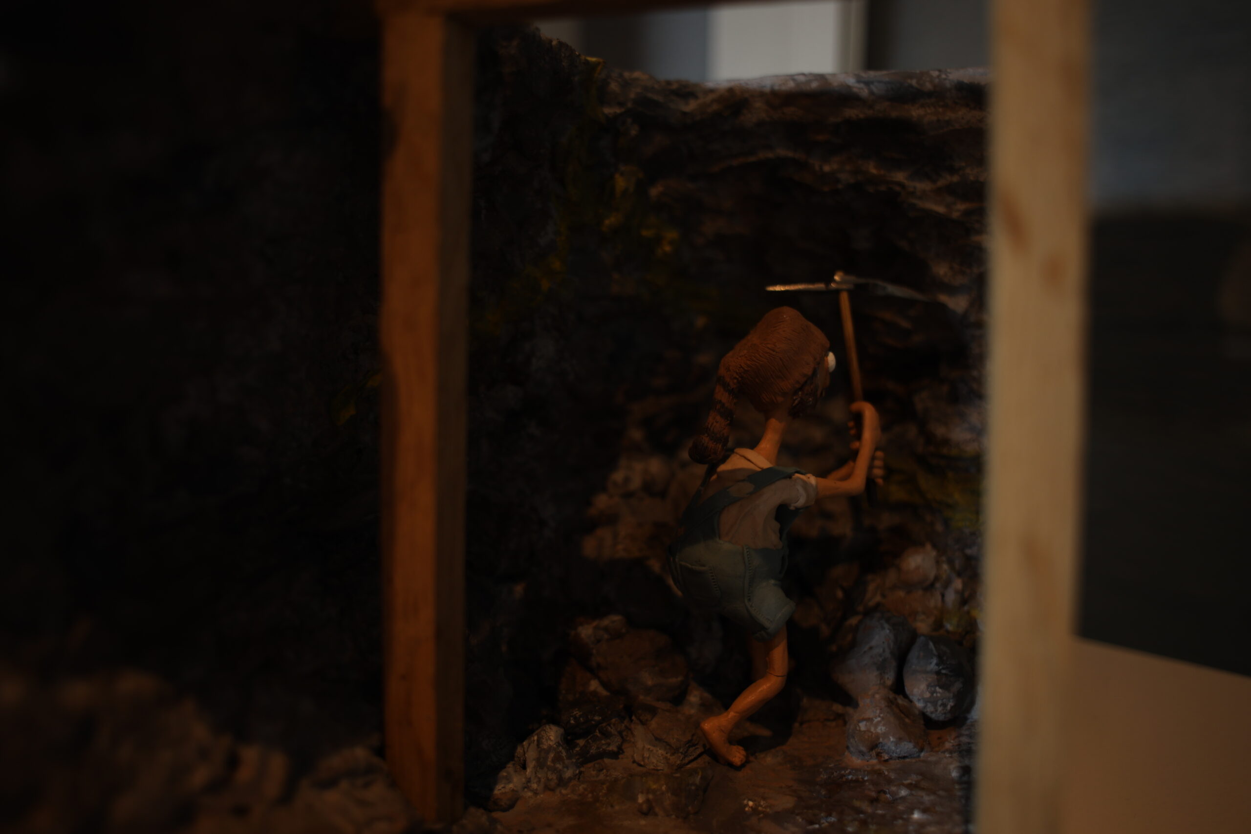 Then I started making it more into a diorama. Out of a wooden board as a base and insulation foam, I started building up the mine shaft environment. By plucking the foam and adding the plucked bits back in other places, I tried for a mix between natural rock formation and already mined out.