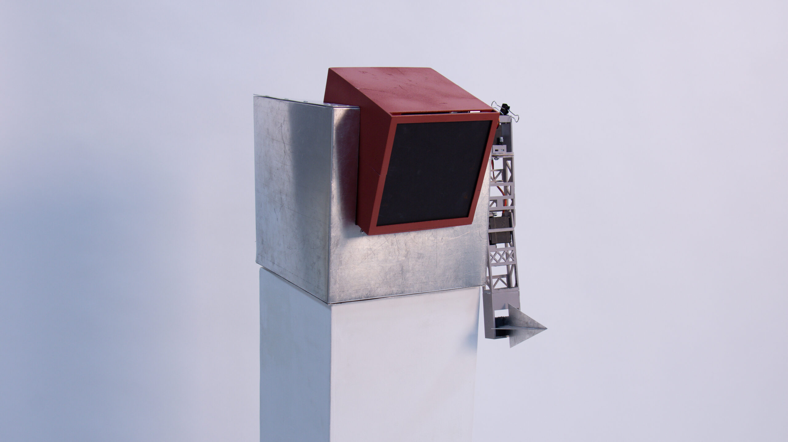At first it is immobile. After an interval it lifts its arm to prepare to stab itself in the face. It cringes and braces itself to suggest it doesn’t want to. Whereafter it however still pushes through and stabs its face in a random place for a random number of times. Lastly it eases again and goes back to the immobile starting pose to helplessly wait to punish itself again.